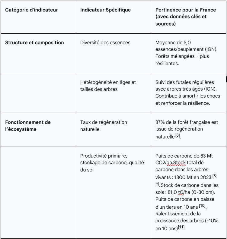 Pour comprendre la capacité de résilience d’un écosystème forestier, des indicateurs concrets, capables de refléter sa santé, sa dynamique interne et sa réaction face aux perturbations existent. Ces indicateurs s’organisent autour de trois grands axes : la structure des peuplements, le fonctionnement de l’écosystème et sa réponse aux chocs environnementaux.
