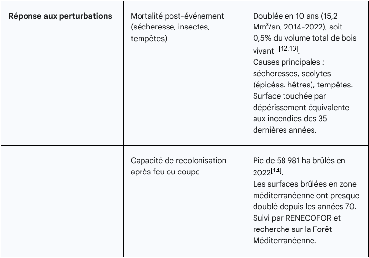 L’un des marqueurs les plus visibles d’un affaiblissement de la résilience forestière est l’augmentation rapide de la mortalité des arbres. En France, celle-ci a doublé en moins de dix ans, passant de 7,4 millions de mètres cubes par an entre 2005 et 2013 à 15,2 millions entre 2014 et 2022, soit environ 0,5 % du volume total de bois vivant chaque année [12,13].